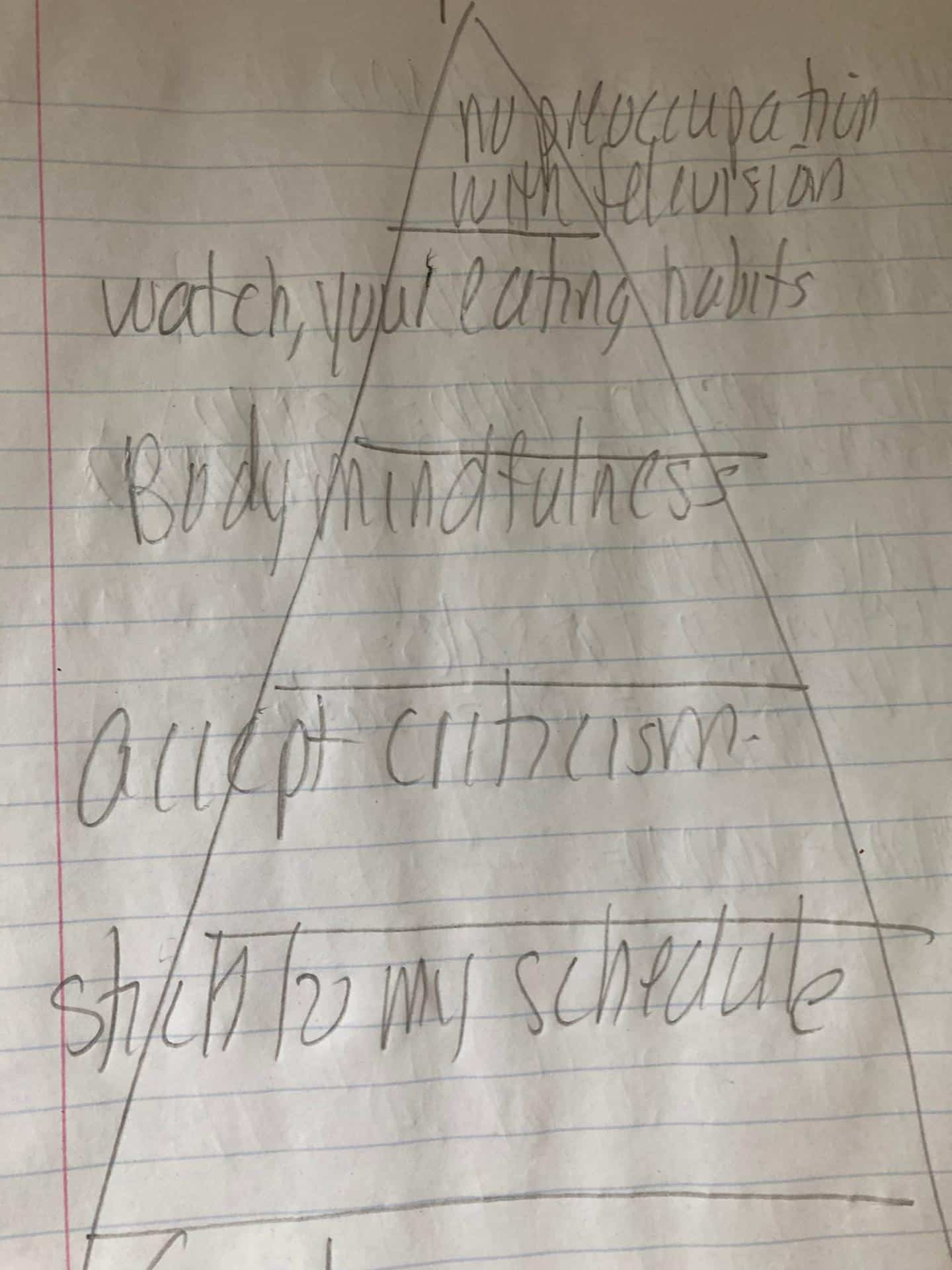 The main concept of Mindful Monday this week was how to keep myself focused upon my goals and be at peace with myself through meditation. Meditation is a quiet time to reflect upon my personal activities. Meditation also means letting go of unrealistic expectations and focusing on being present. We also went over our self-care plans which will help me stick to my goals and not giving into any distractions. It is a way to keep my mind on track, sort of like an agenda.