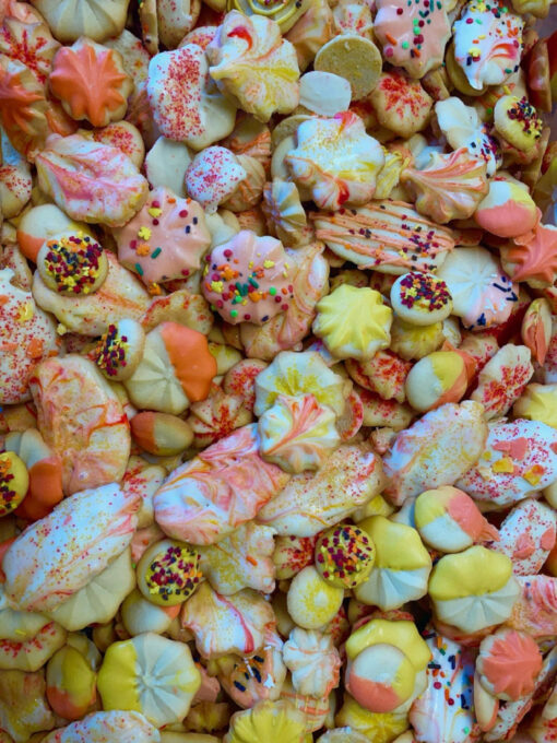 Melt-in-your-mouth butter spritz tea cookies, decorated in seasonal colors. Sold in pound increments-just add the number of pounds you would like!