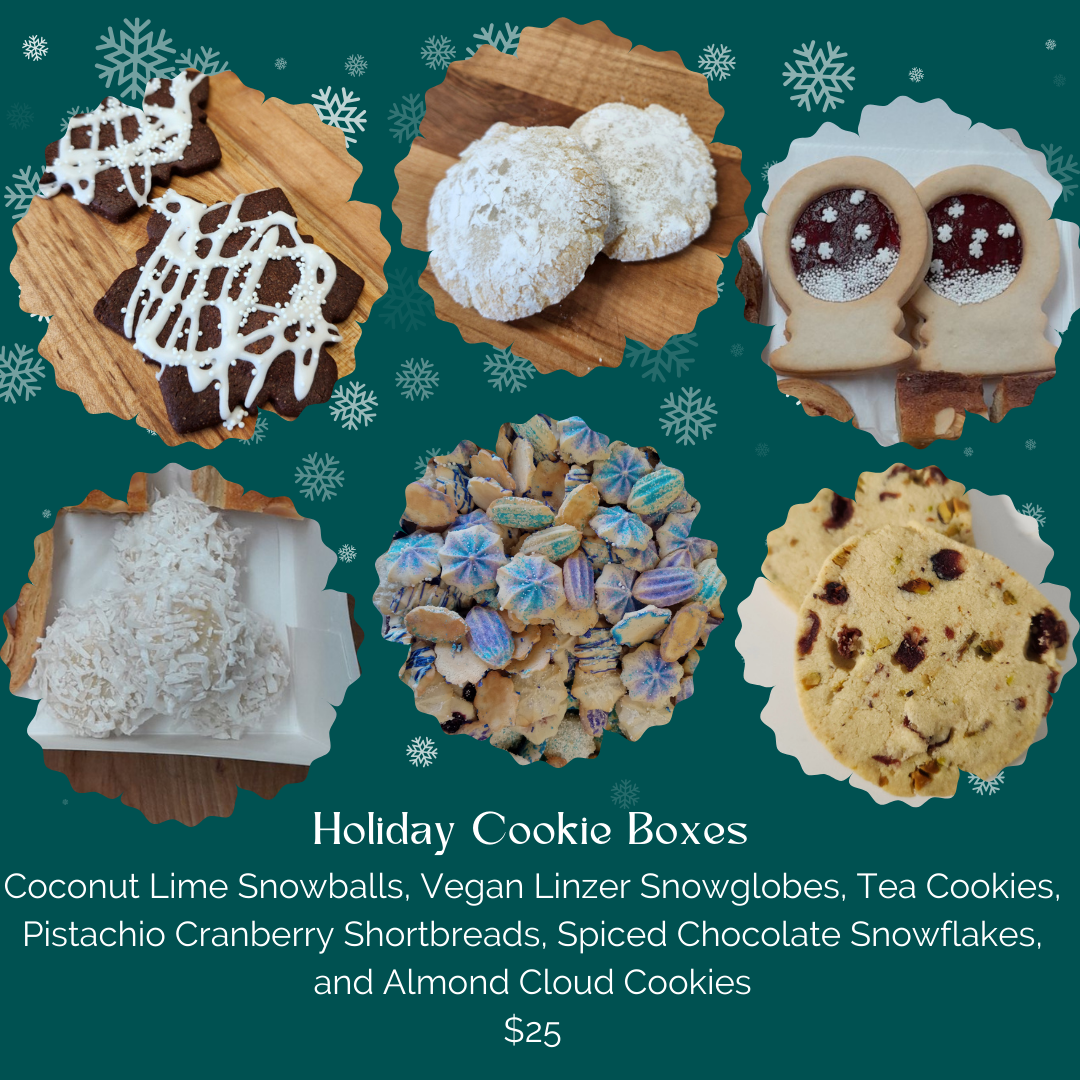 Mix box of tasty treats, great for gatherings! Contains Spiced Chocolate Snowflakes, Almond Cloud Cookies, Coconut Lime Snowballs, Vegan Linzer Snow Globes, Pistachio Cranberry Shortbreads, and a quarter pound of tea cookies in seasonal colors.