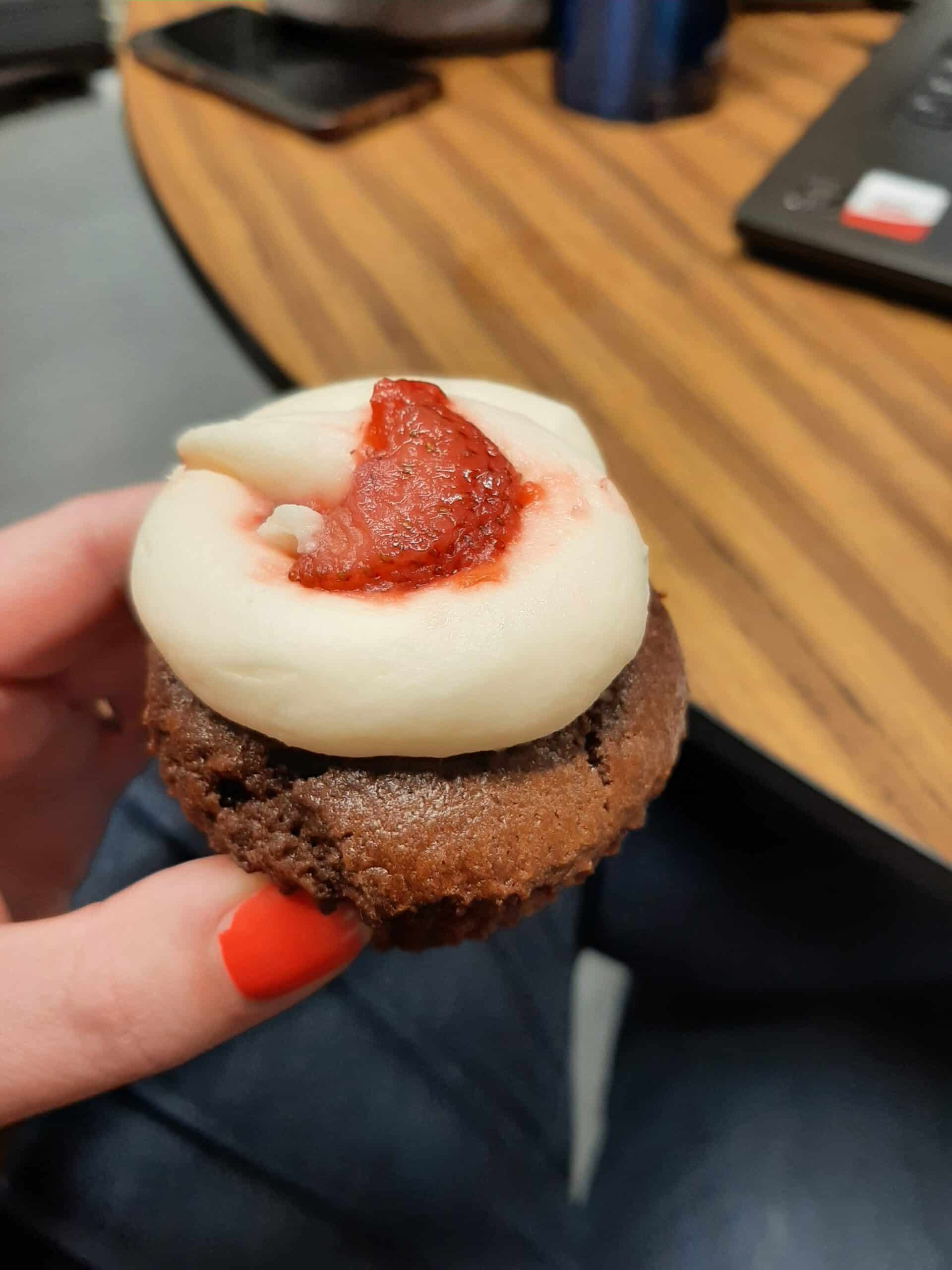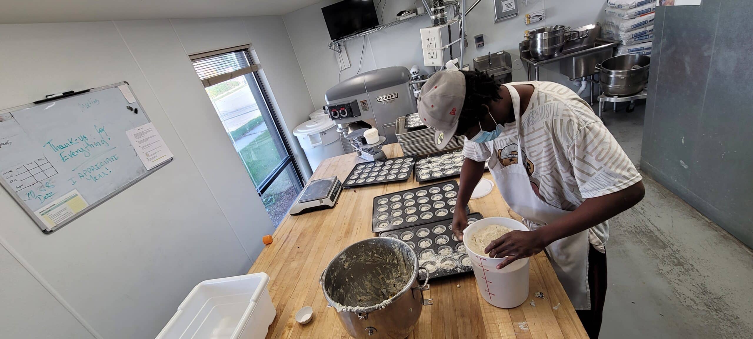 As one class enters the kitchen and their second month of the program, we feel bittersweet because we also graduate the previous group, which this time was just Spurge. He rocked it out in the kitchen and was a huge help during the busy pie season. We are so proud of what he has accomplished. Watching him grow the last couple months has been really special. He has talked about coming back and getting a couple more of the certificates, so it may not be the last time we see him. He did his final presentation which involves finding a recipe, changing something in it, and converting it to a commercial batch. Then he actually has to bake it and we get to taste test! Spurge made delicious chocolate cupcakes. His change was adding fruit. He did two different flavors: one with a strawberry on top and a banana filling and the opposite, banana on top with strawberry filling. It was so good-I’m glad I took a pic before digging in or we would have nothing to show our readers!